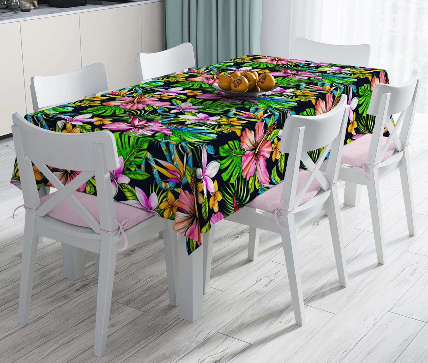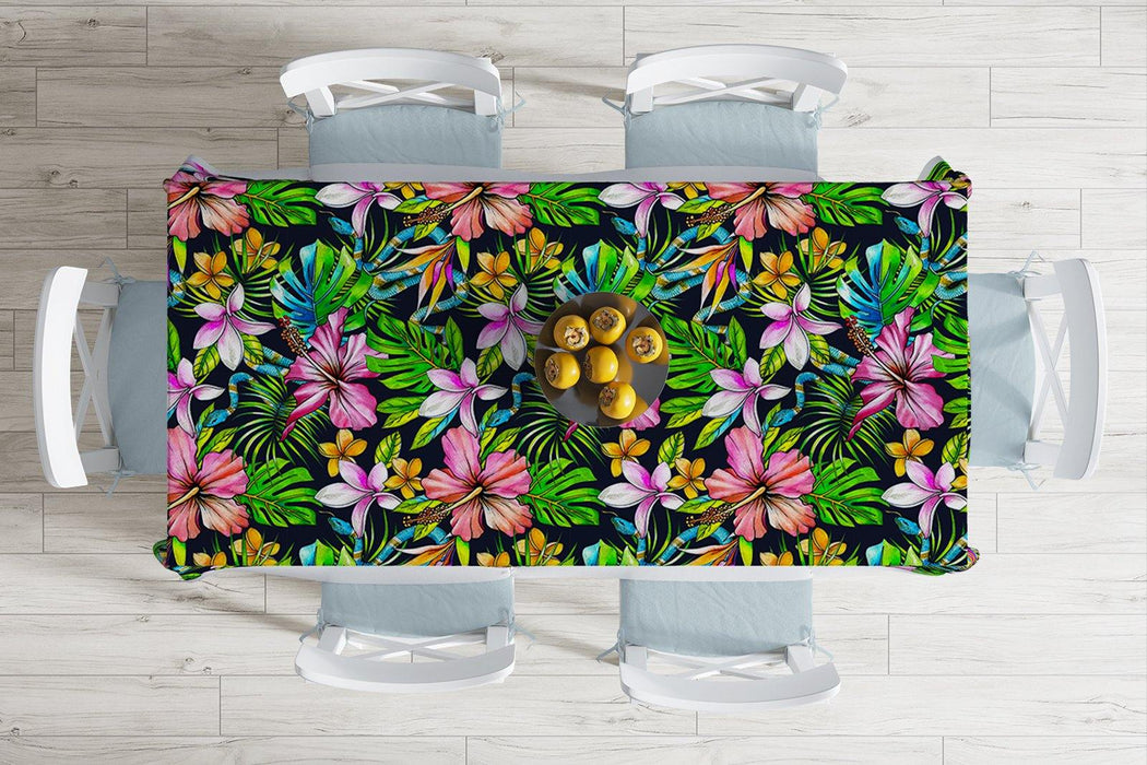 Lacivert Zeminli Tropikal Desenli Dijital Baskılı Leke Tutmaz Masa Örtüsü