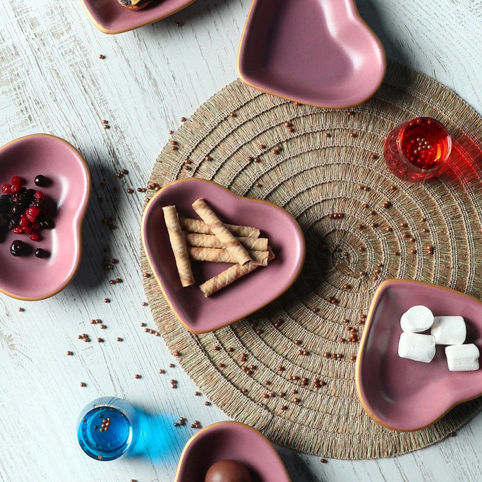 Sade bir aile yemeği veya kalabalık bir partide sizlere eşlik edecek 6 adet mat violet gold kalp çerezlik servislerinize çok şık bir hava katacaktır. Gözalıcı sunumlar yapmanızın püf noktası olacak bu ürünler, masanıza havalı bir görünüm kazandıracaktır. Ürün İçeriği; *6 adet 14cm Çerezlik • Yüzey Yapısı: Mat • Malzeme: Stoneware / Earthenware • Renkleri ve baskısı solmaz. • Mikrodalga fırınlarda kullanılabilir. • Kolay temizlenir, mikrop barındırmaz. • Bulaşık makinesinde 50°C'de yıkanabilir. • Tamamen sağlıklı ve ekolojik malzeme yapısına sahiptir. • Türkiye'de üretilmiştir.
