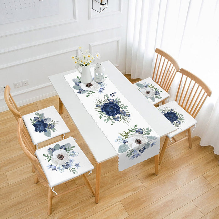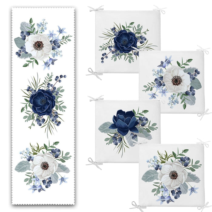 Mavi ve Beyaz Gül Özel Tasarım 4 Fermuarlı Sandalye Minderi 1 Runner Seti