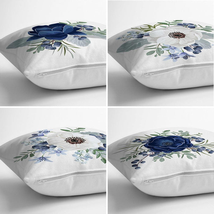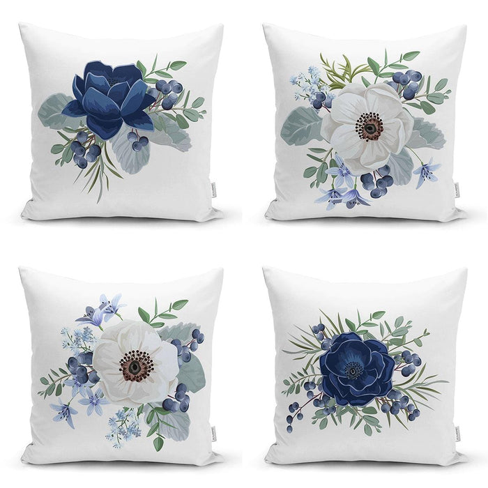 Mavi ve Beyaz Gül Tasarımlı Dijital Baskılı Modern 4lü Kırlent Kılıfı Seti