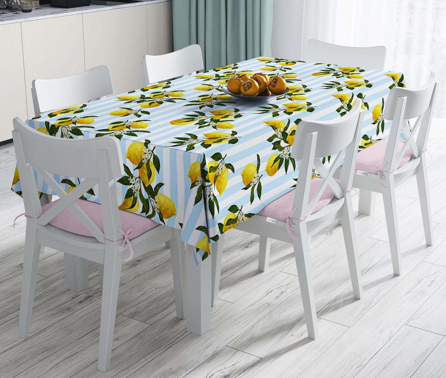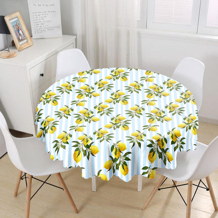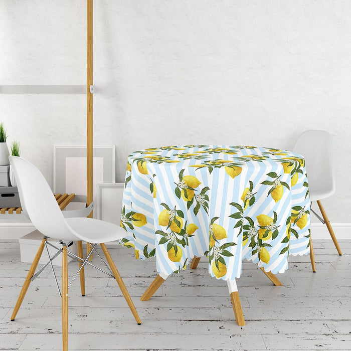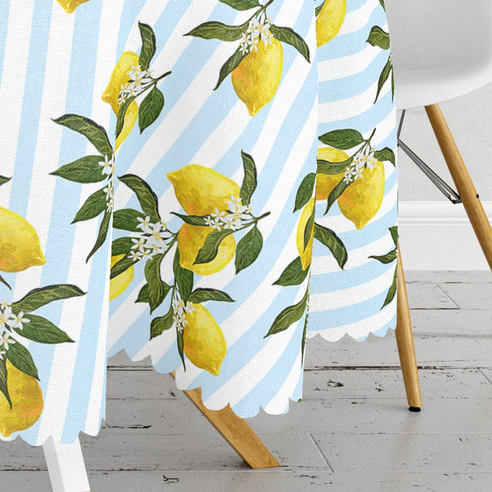 Mavi Çizgili Limon Desenli Dijital Baskılı Dekoratif Leke Tutmaz Masa Örtüsü