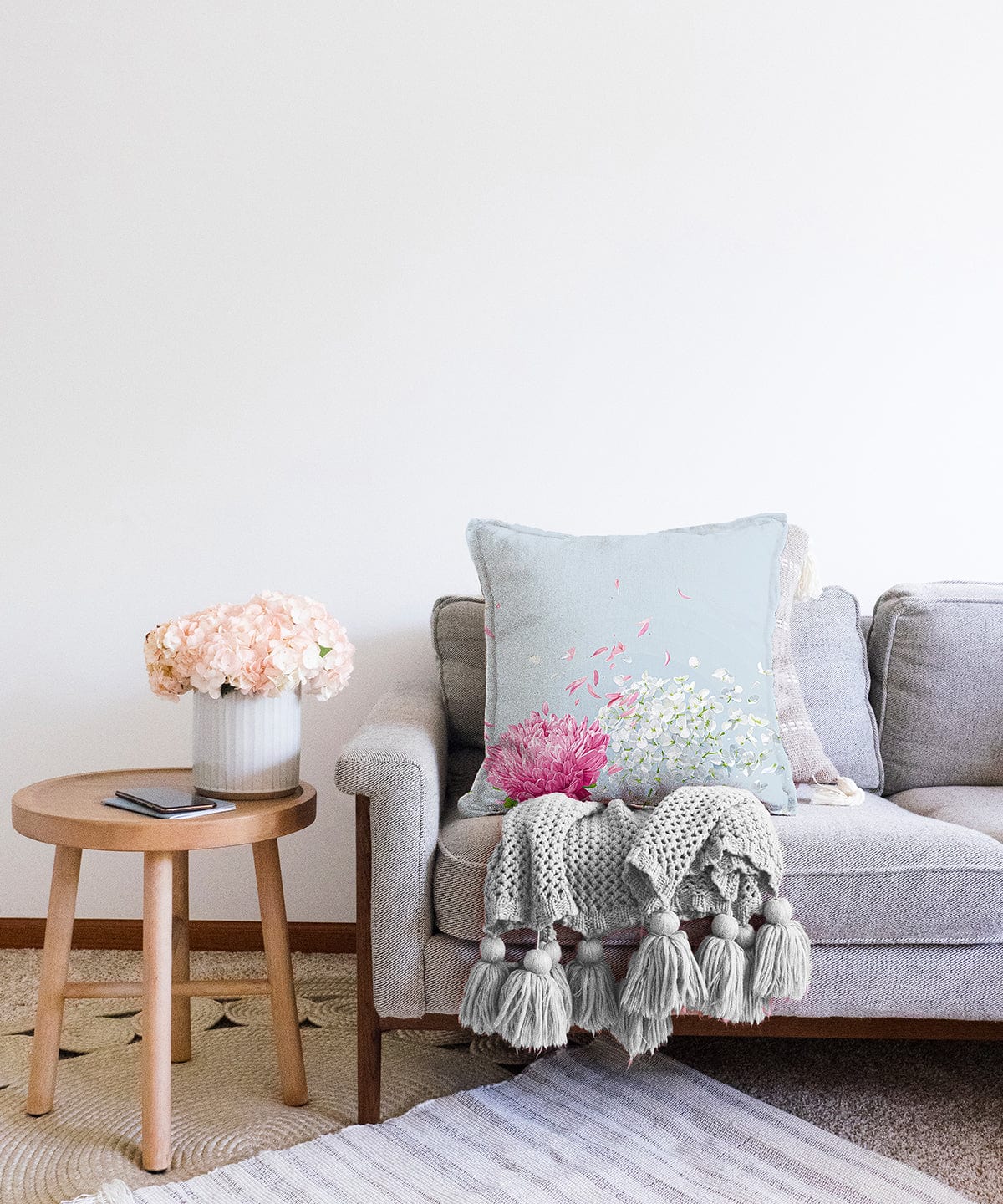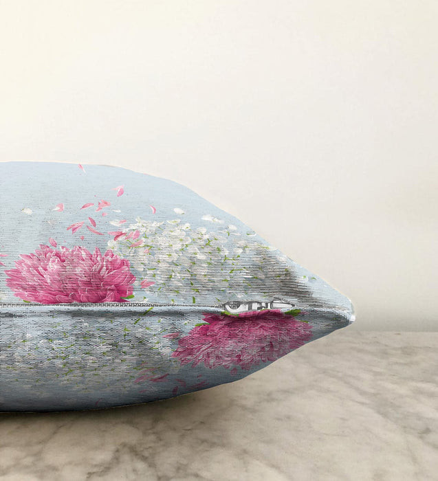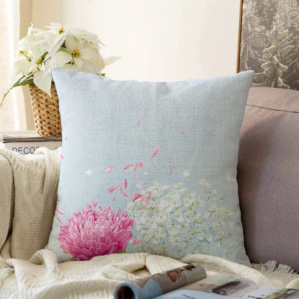 Mavi Zeminde Fuşya Beyaz Ortanca Çiçeği Dijital Baskılı Raşel Kadife Kırlent Kılıfı