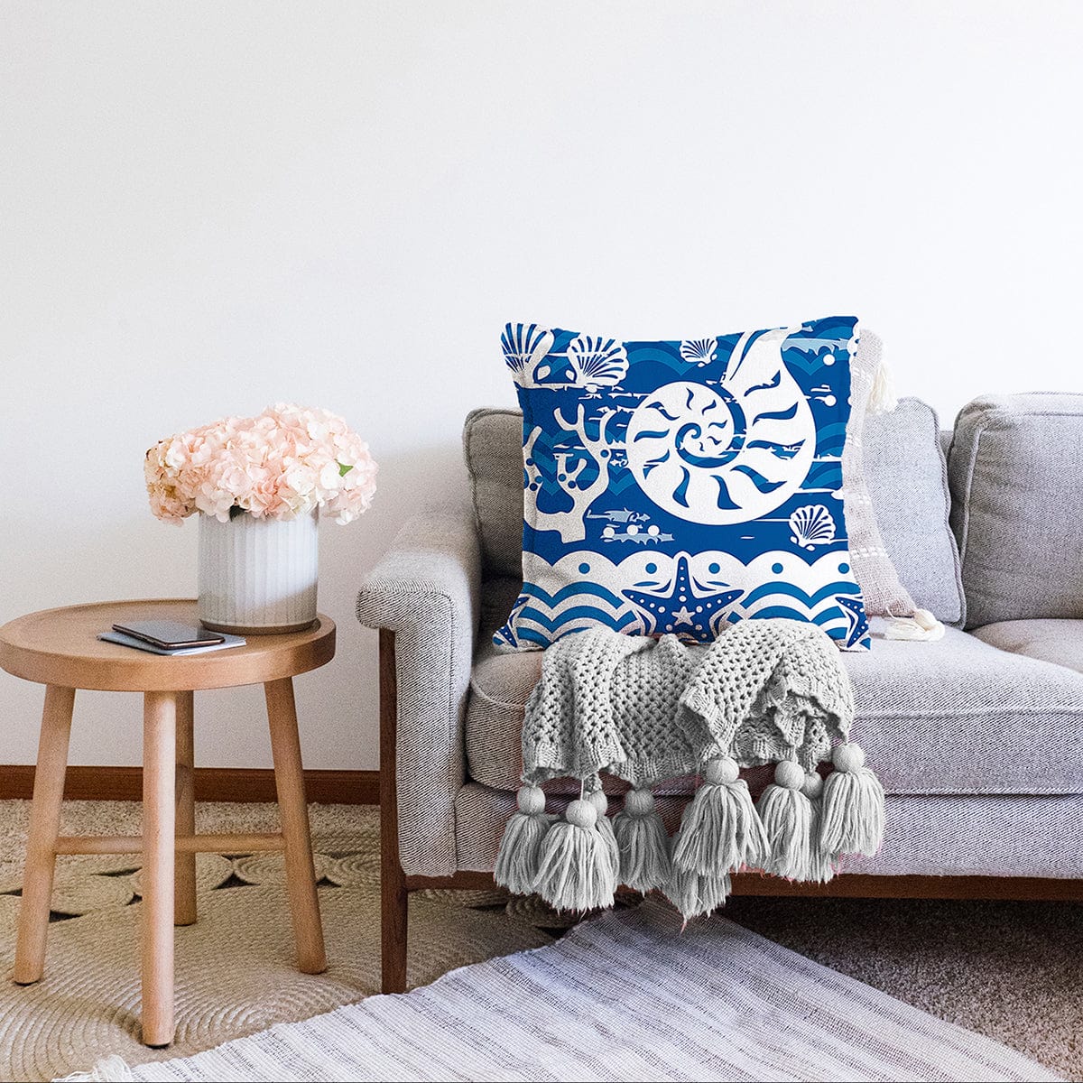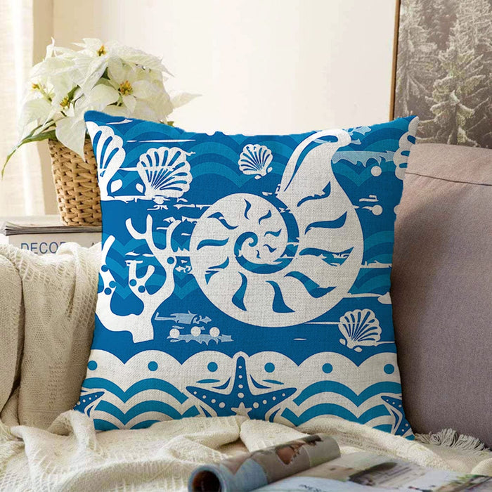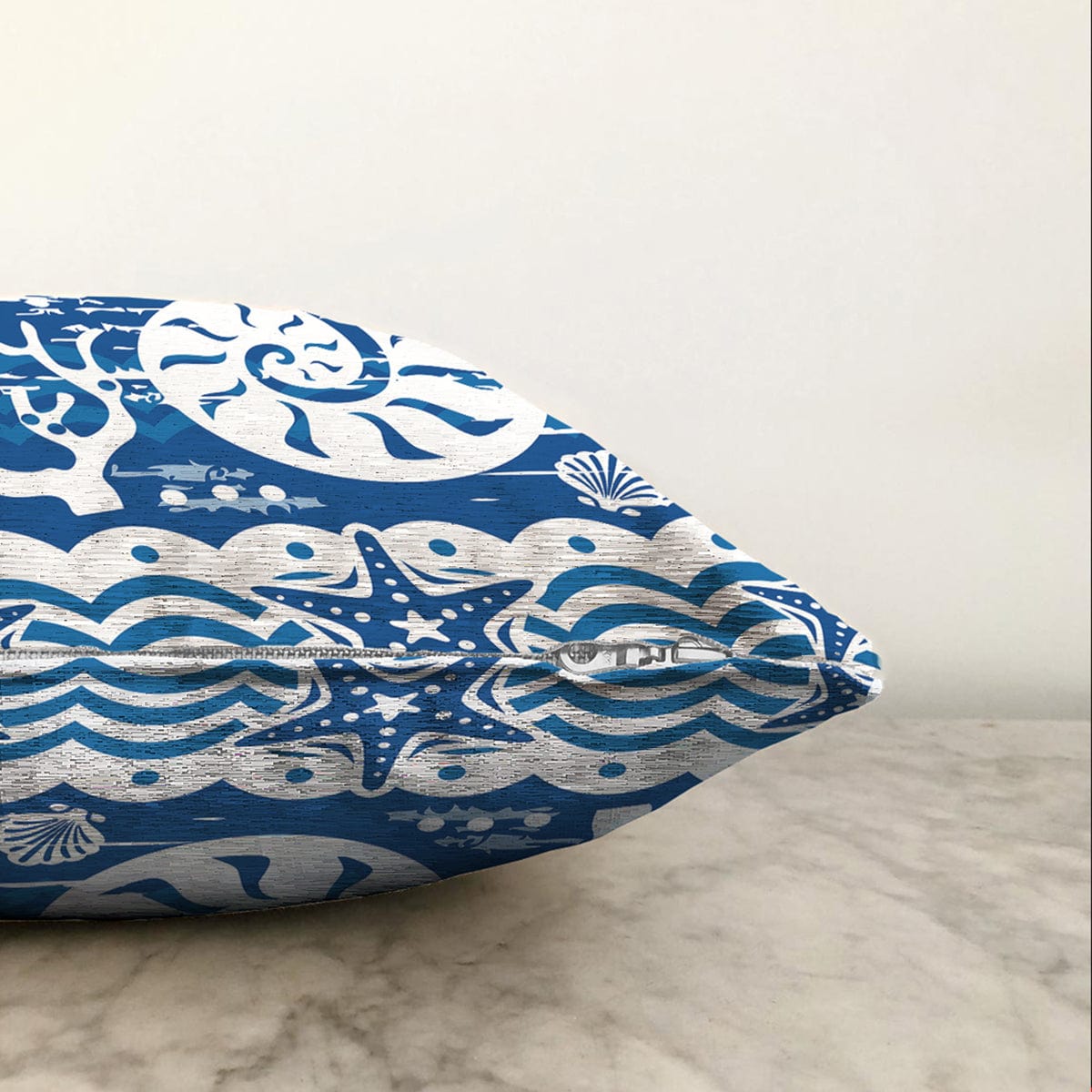 Mavi Zeminli Deniz Feneri Desenli Dijital Baskılı Modern Raşel Kadife Yastık Kırlent Kılıfı