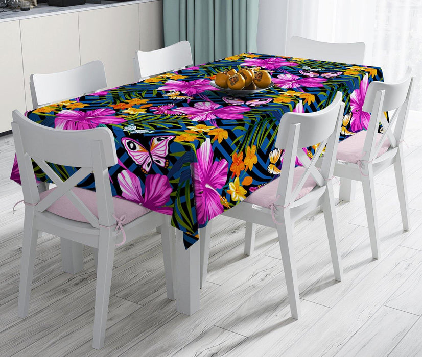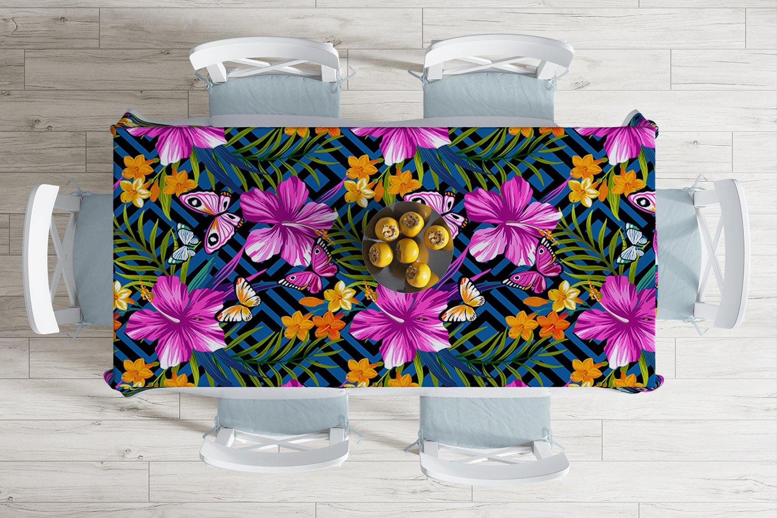 Mavi Zeminli Geometrik Çiçekler Modern Tasarımlı Leke Tutmaz Masa Örtüsü