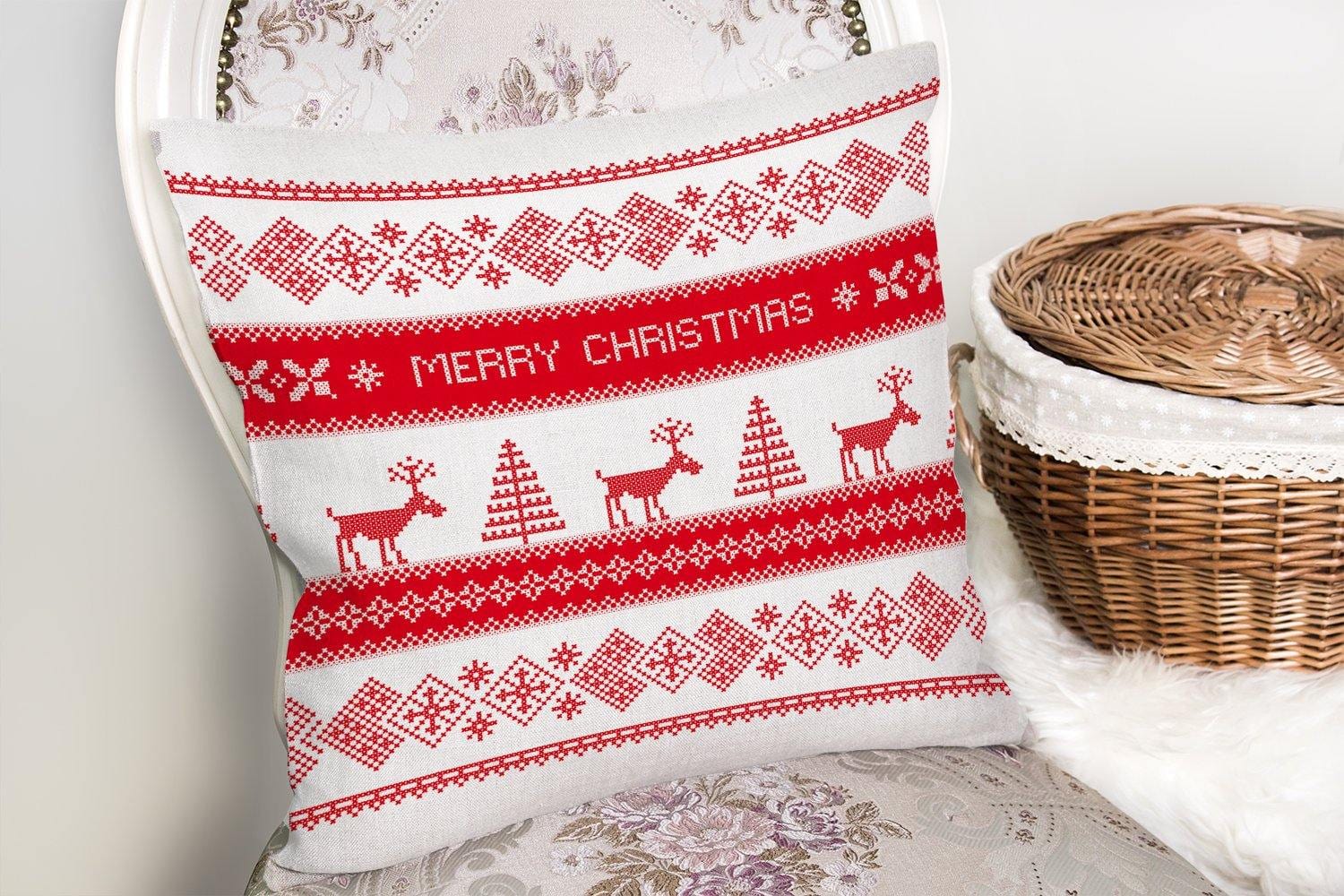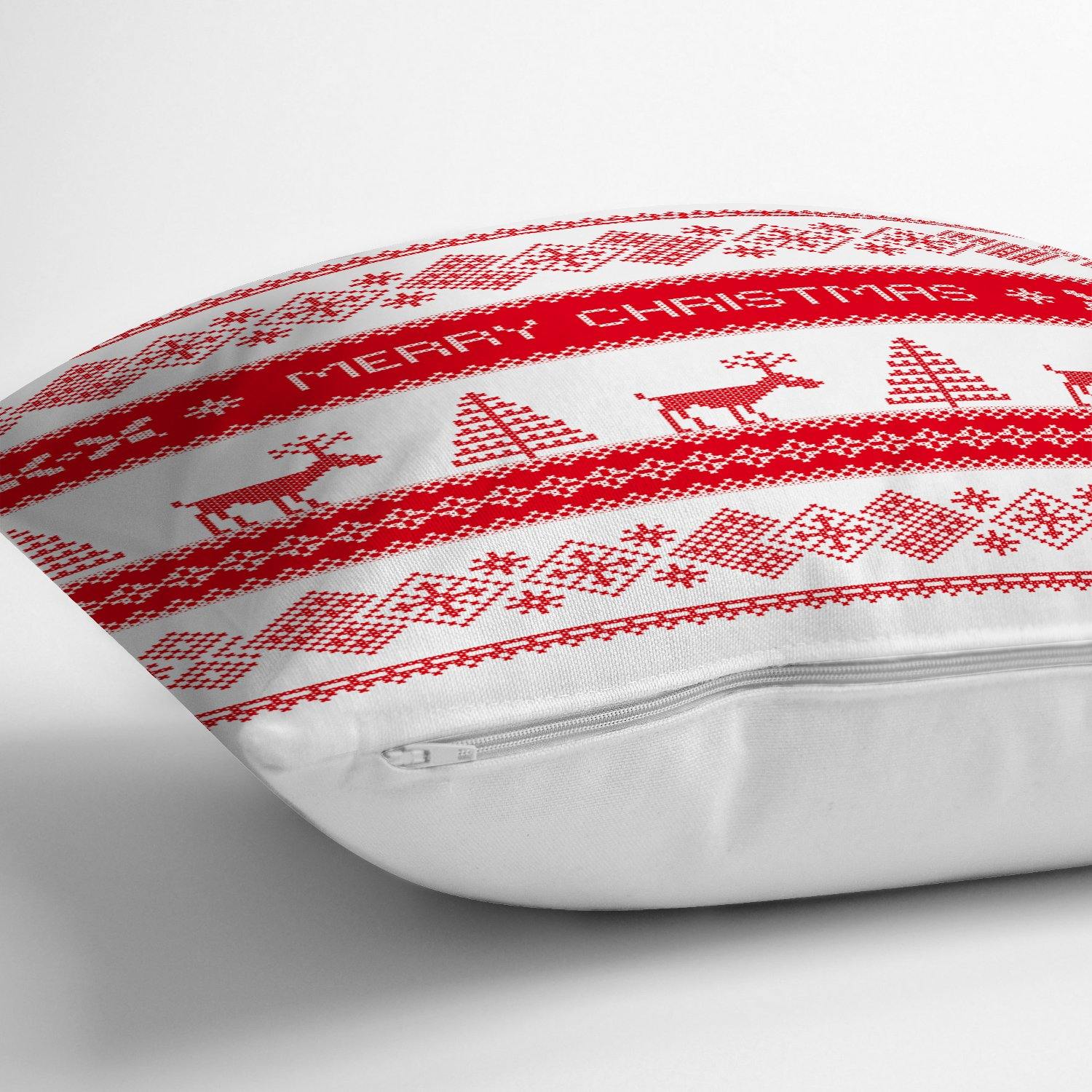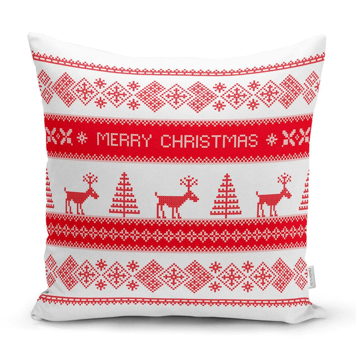 Merry Christmas Kanaviçe Görünümlü Geyikler Baskılı Yastık Kırlent Kılıfı 43x43cm