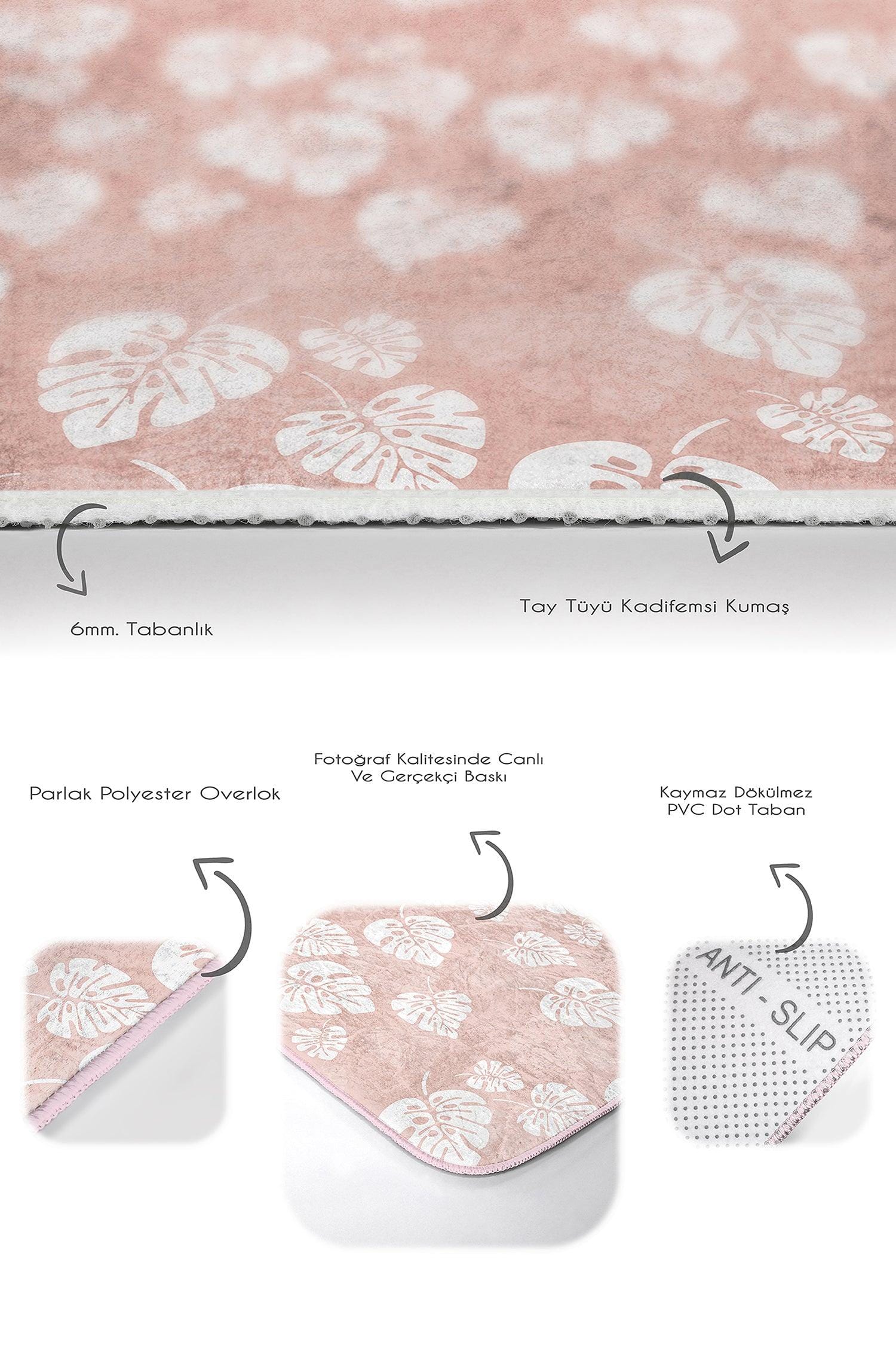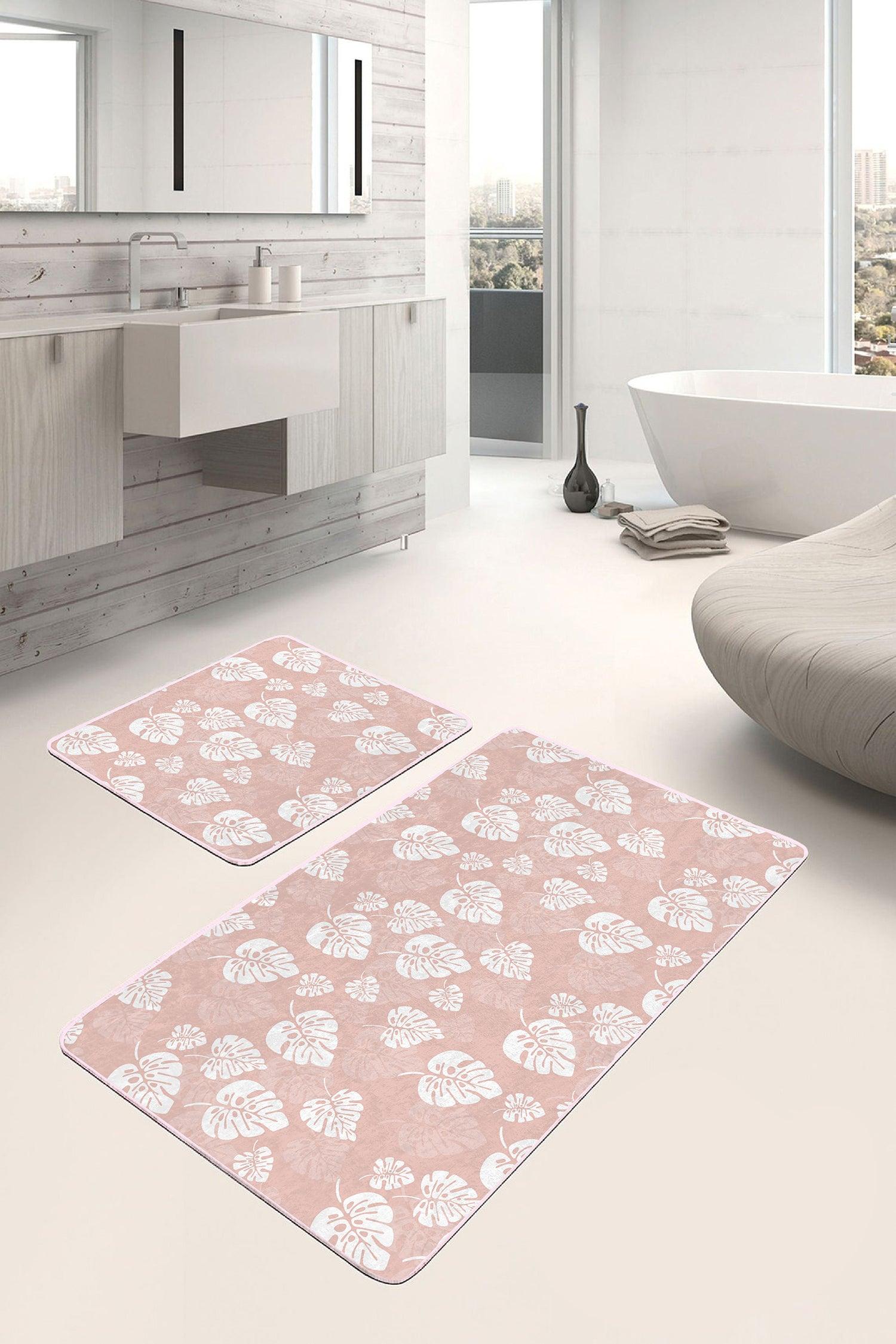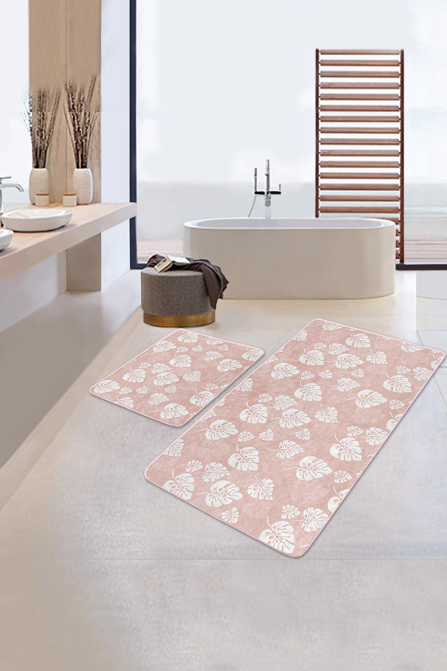 Pudra Zemin Tropik Yapraklar Dijital Baskılı 2li Banyo Paspas ve Halısı Takımı Kaymaz Taban Yıkanabilir