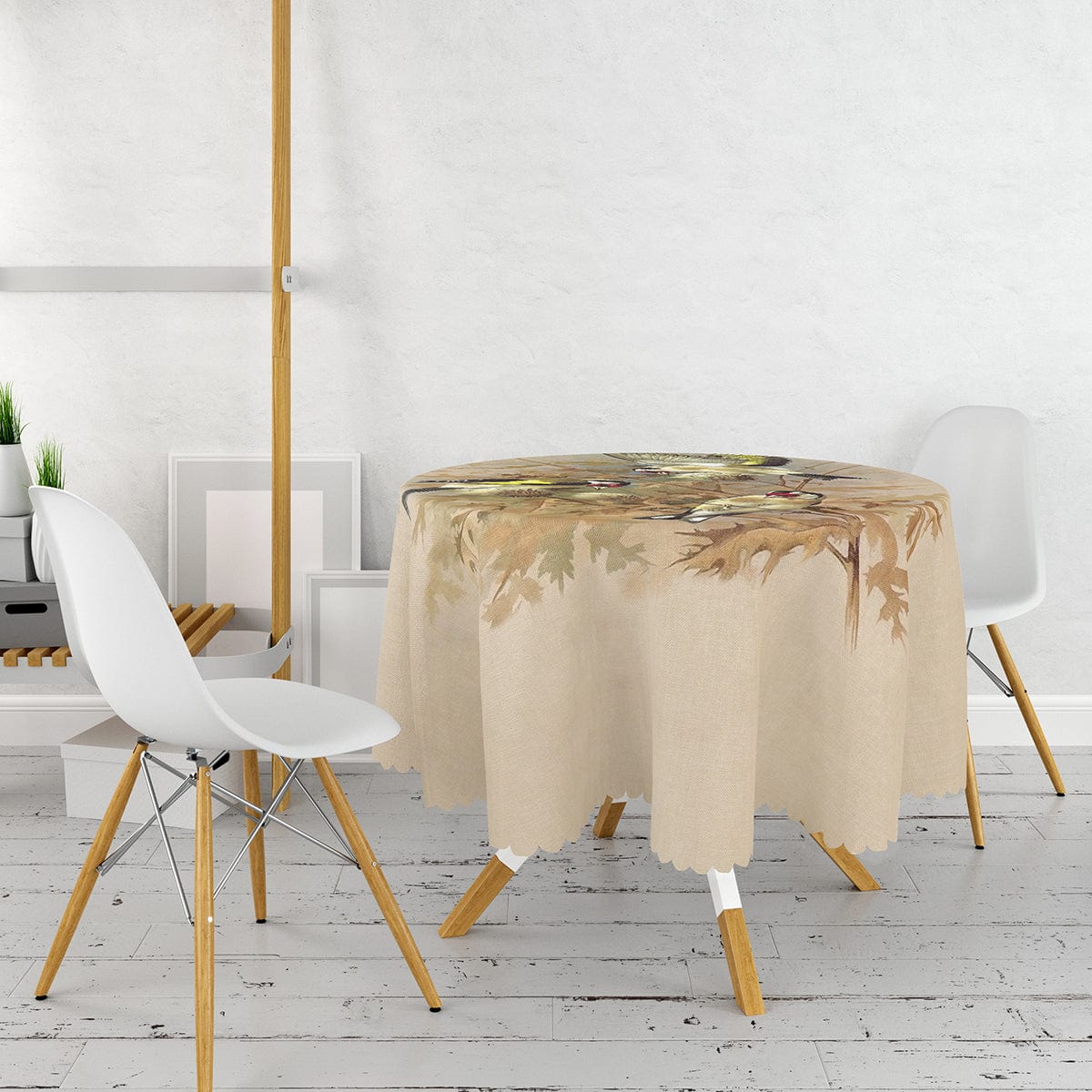 Kahverengi Zeminde Kuşlar Dijital Baskılı Yuvarlak Masa Örtüsü