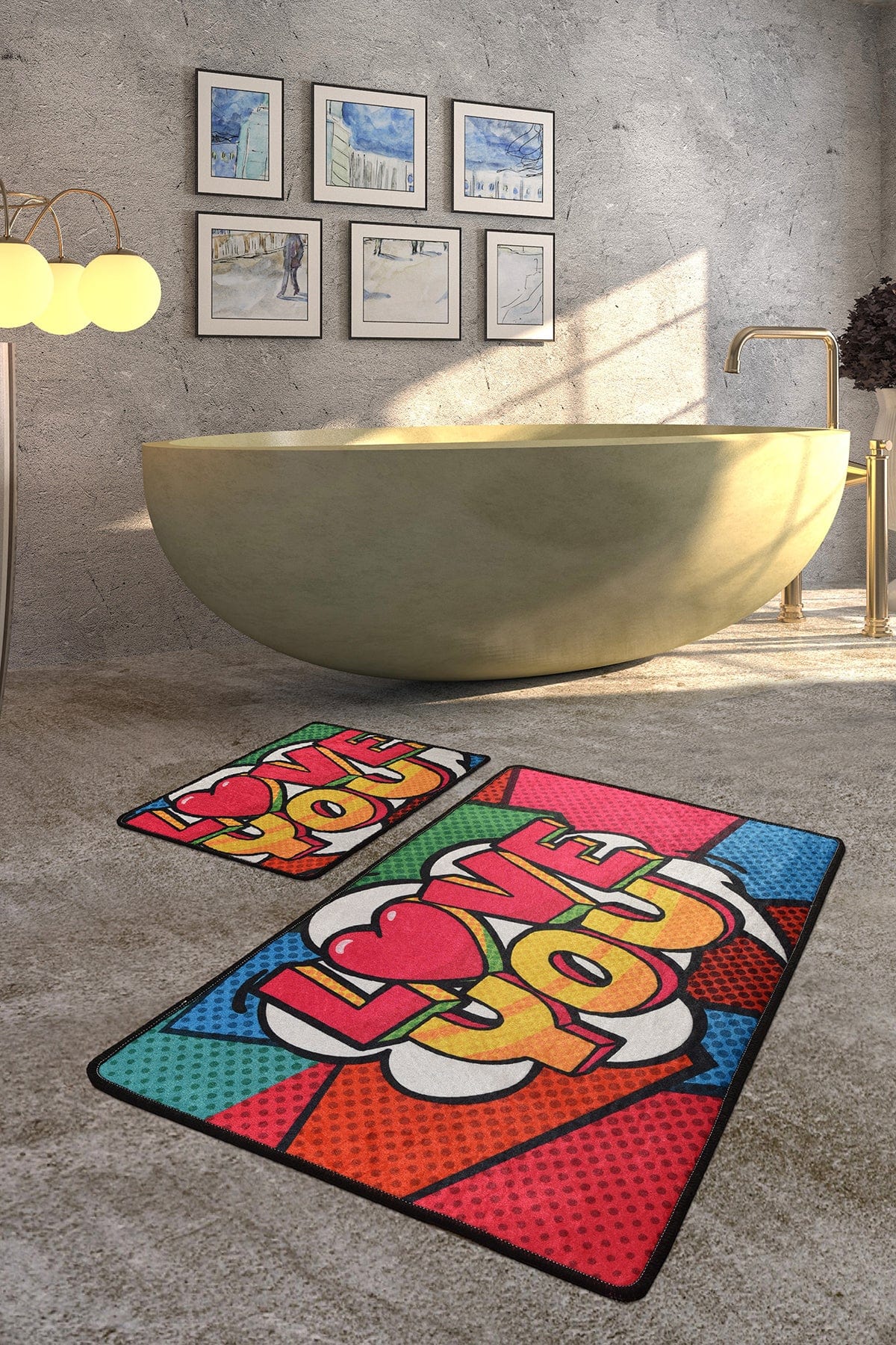 Red Love Dijital Baskılı 2li Set Banyo Paspas ve Halısı, Kaymaz Taban, Yıkanabilir
