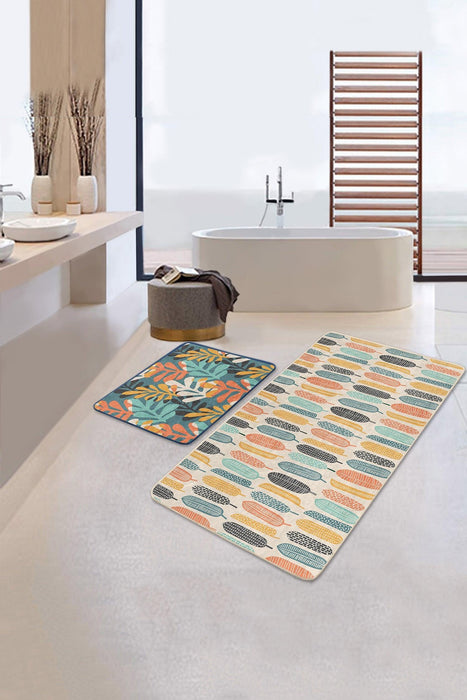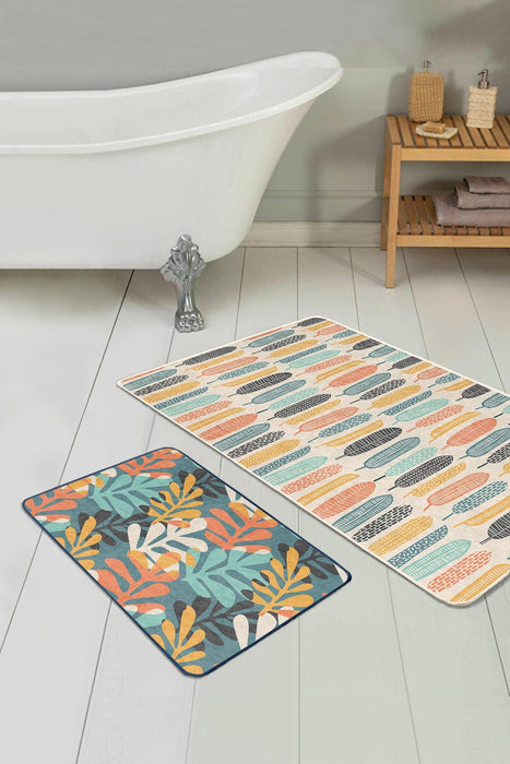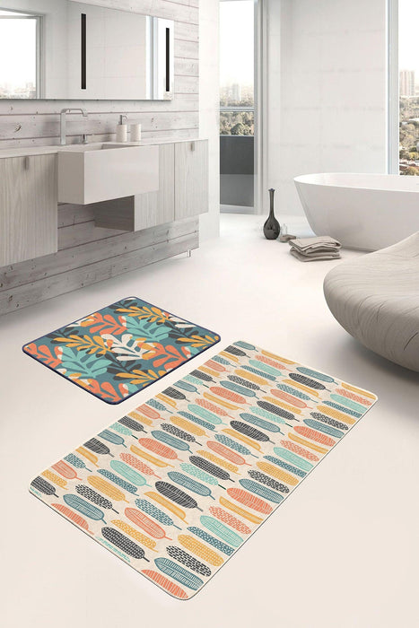 Renkli Tropik Yaprak Tasarımlı Dijital Baskılı 2li Banyo Paspas ve Halısı Takımı Kaymaz Taban Yıkanabilir