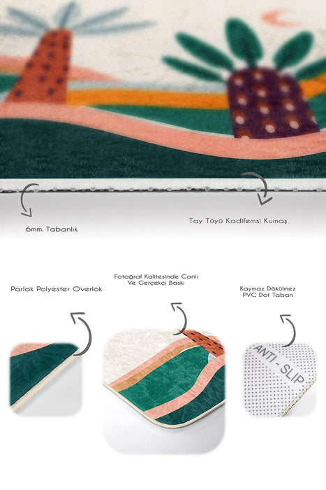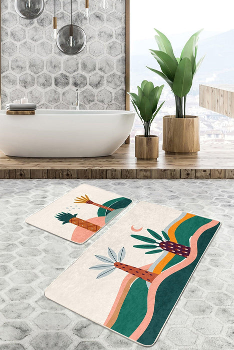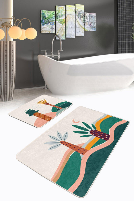Renkli Zemin Palmiye Ağaç Tasarımlı 2li Banyo Paspas ve Halısı Takımı Kaymaz Taban Yıkanabilir