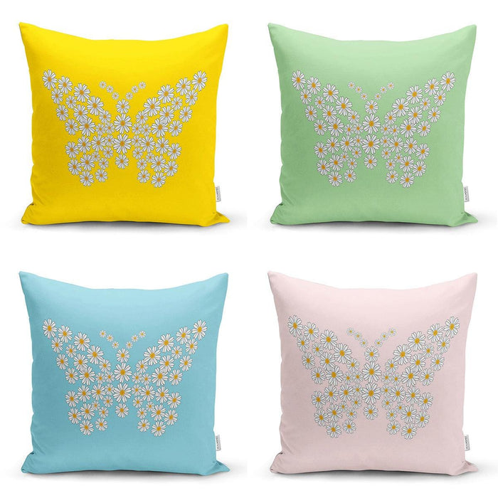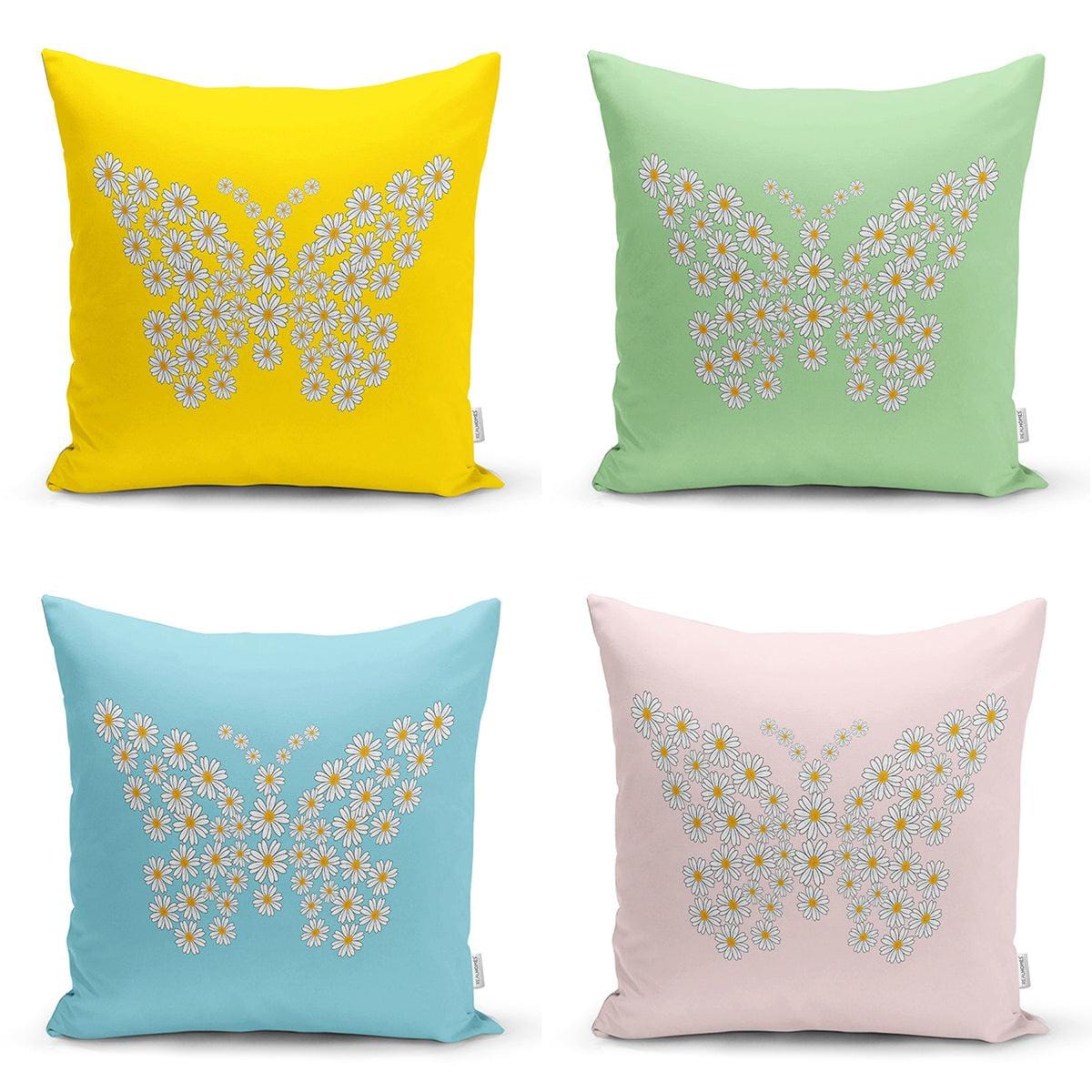 Renkli Zemin Papatya Kelebek Özel Tasarımlı Dijital Baskılı Modern 4lü Kırlent Kılıfı Seti