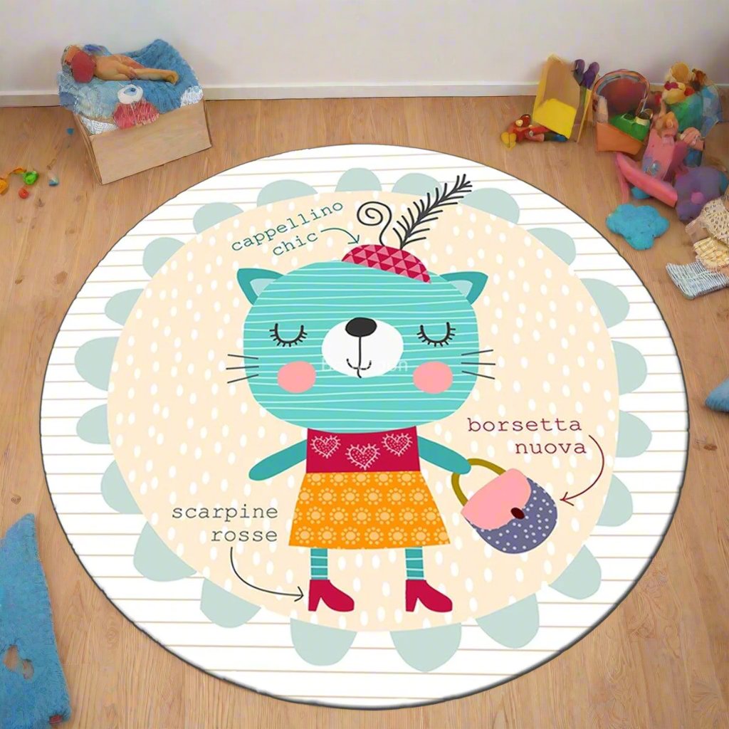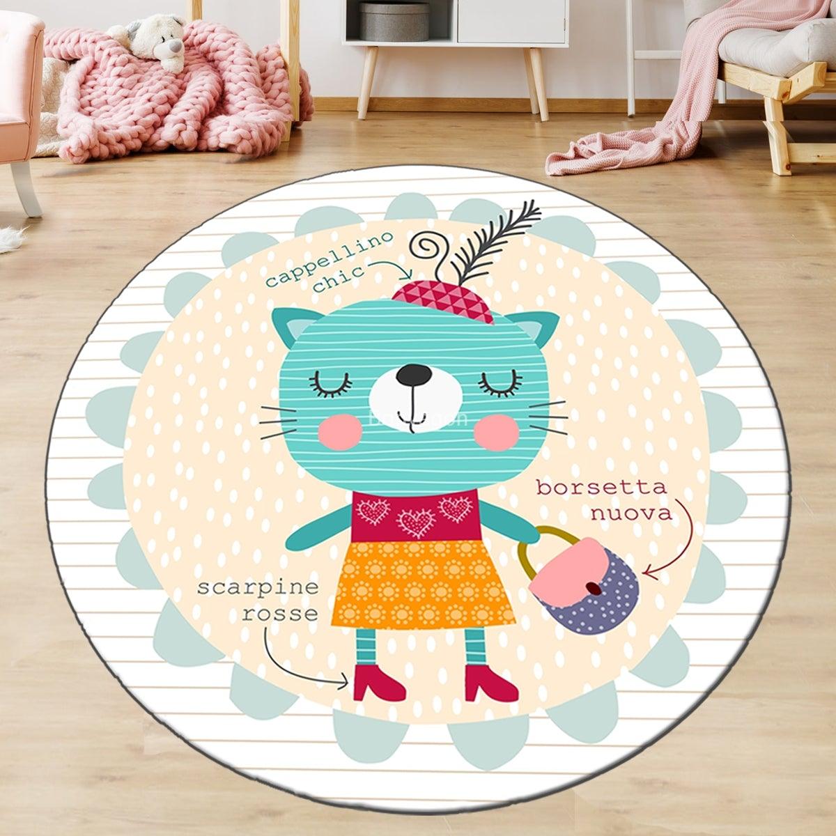 Sevimli Kedi Borsetta Dijital Baskılı Yuvarlak Çocuk Halısı, Kaymaz Taban, Yıkanabilir