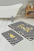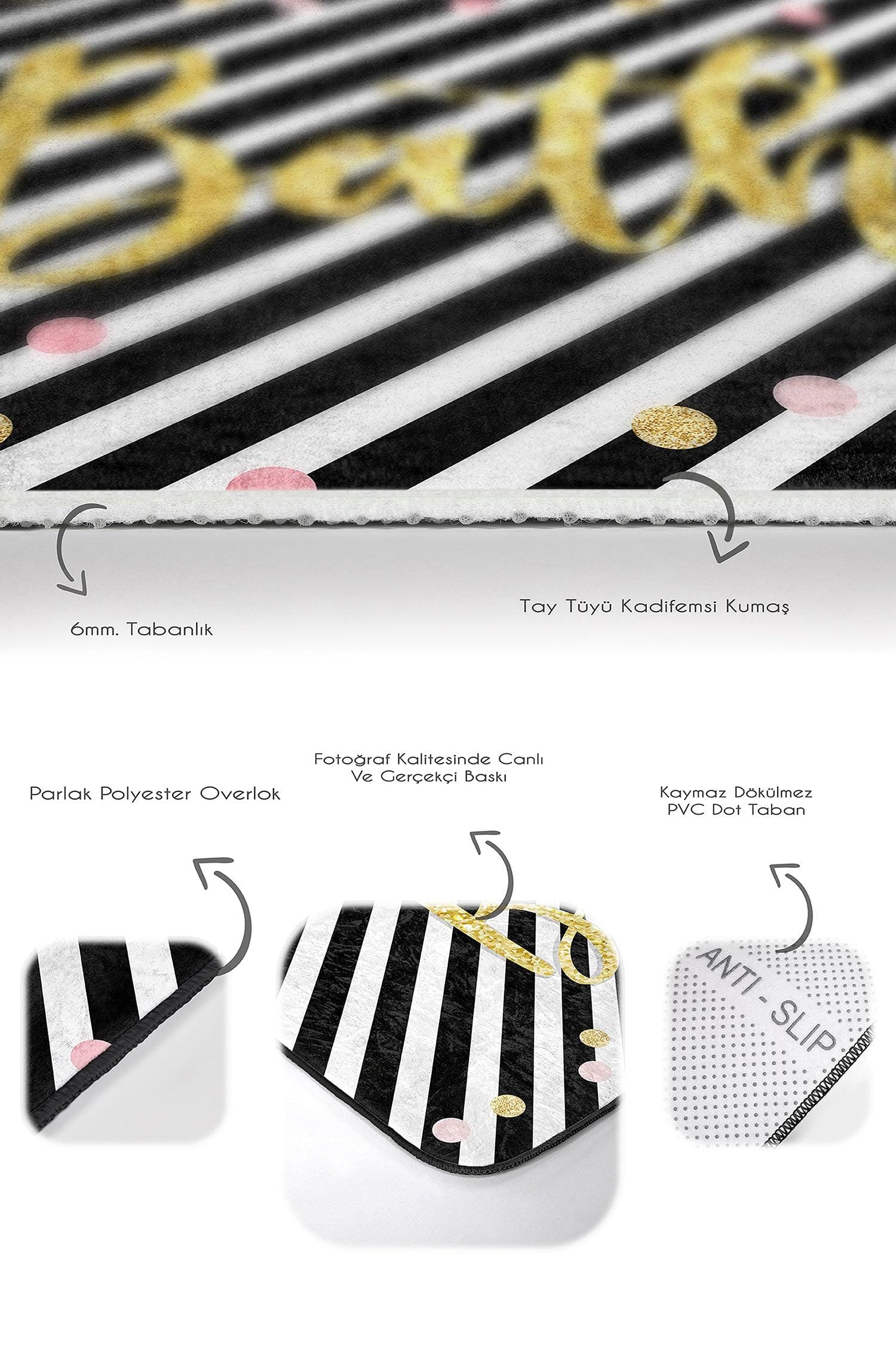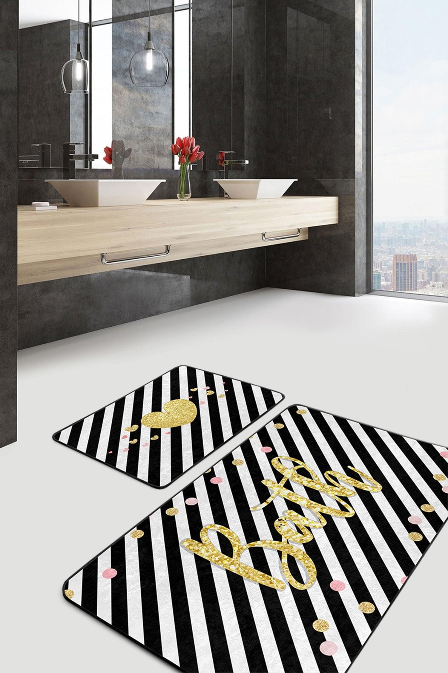 Siyah Beyaz Çizgili Gold Detaylı 2li Banyo Paspas ve Halısı Takımı Kaymaz Taban Yıkanabilir