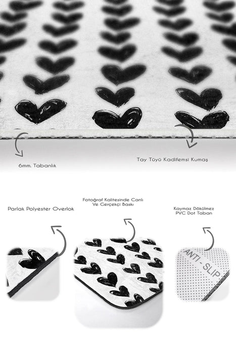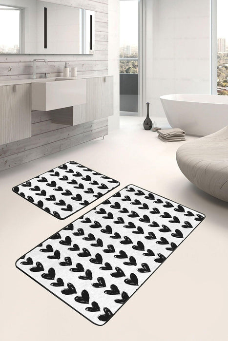 Siyah Beyaz Kalp Motifli 2li Banyo Paspas ve Halısı Takımı Kaymaz Taban Yıkanabilir