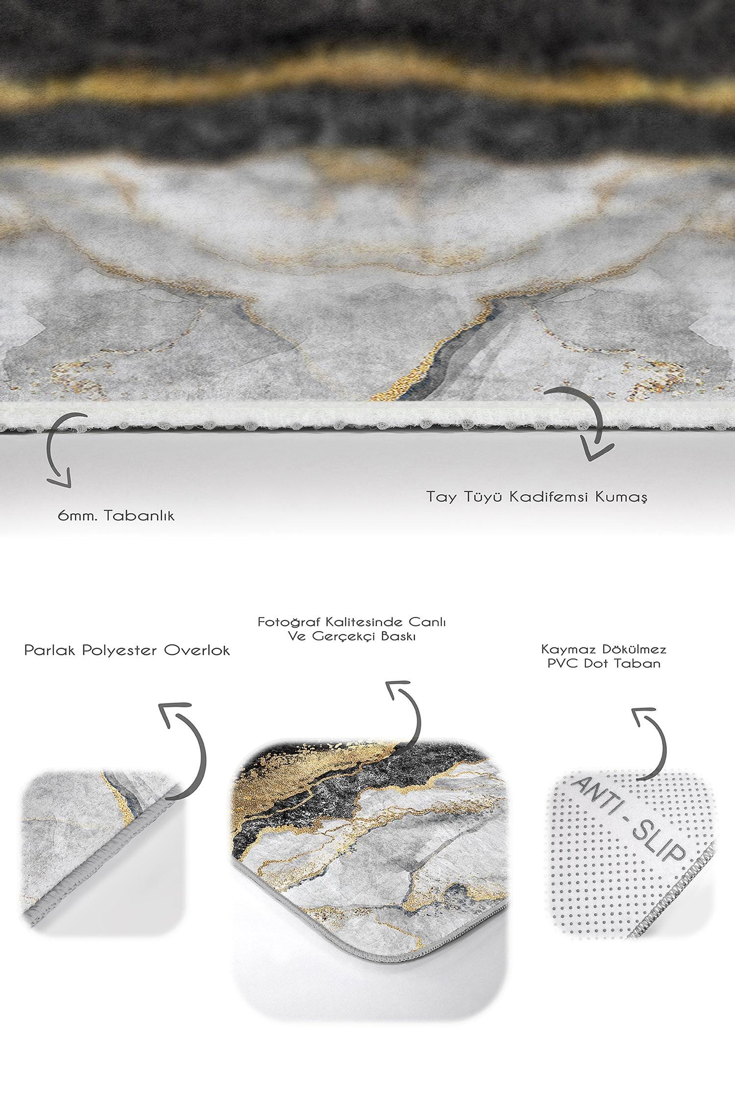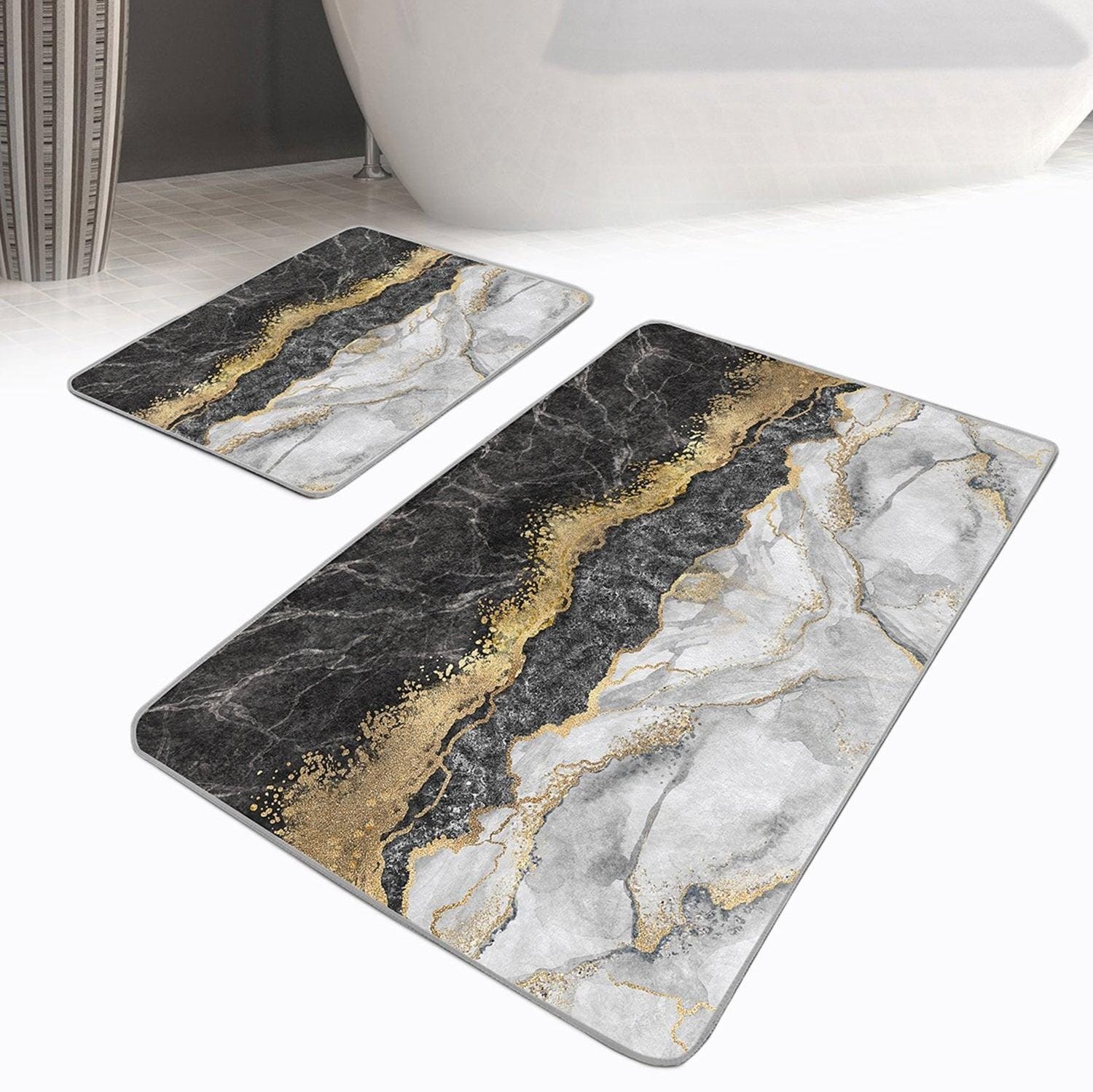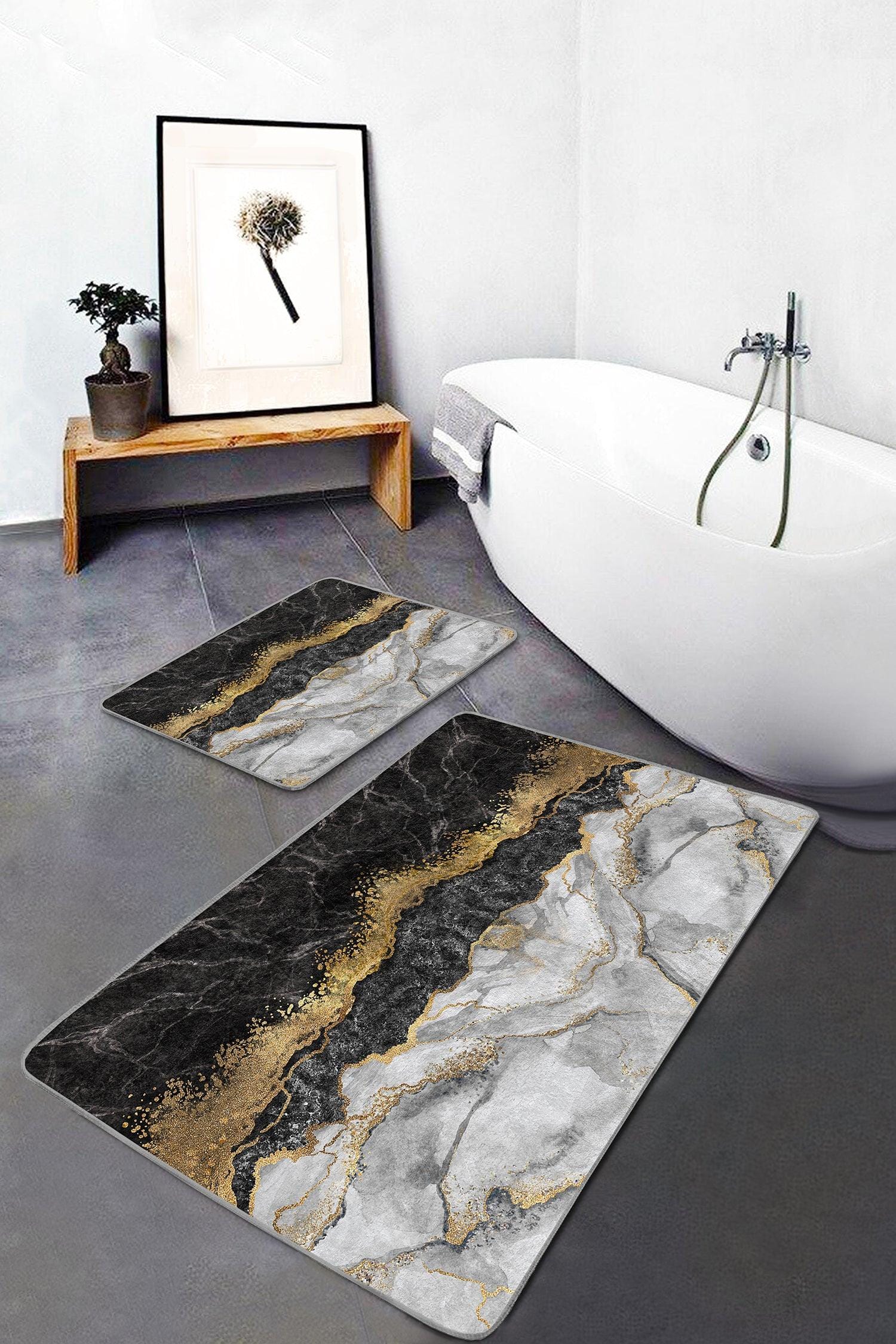 Siyah Mermer Özel Tasarım Dijital Baskılı 2li Banyo Paspas ve Halısı Takımı Kaymaz Taban Yıkanabilir