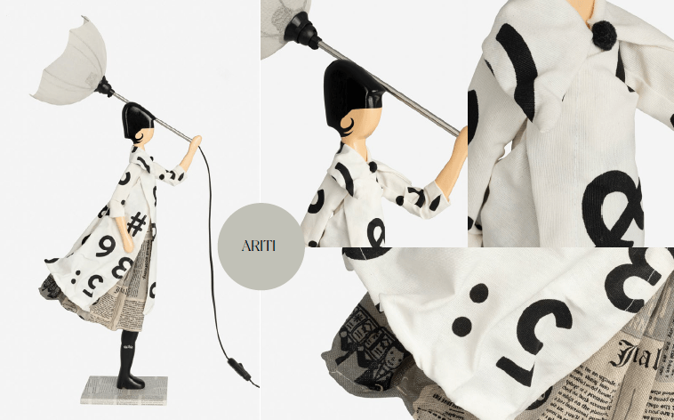 Skitso'ların ters dönmüş şemsiye formundaki aydınlatma başlıkları özel kumaş ve tellerden üretilirken renk seçimi orijinal tasarıma göre belirlenmiştir.