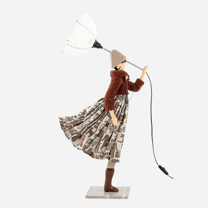 Skitso'ların ters dönmüş şemsiye formundaki aydınlatma başlıkları özel kumaş ve tellerden üretilirken renk seçimi orijinal tasarıma göre belirlenmiştir.