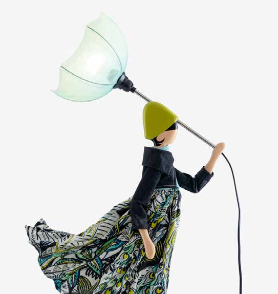 Skitso'ların ters dönmüş şemsiye formundaki aydınlatma başlıkları özel kumaş ve tellerden üretilirken renk seçimi orijinal tasarıma göre belirlenmiştir.