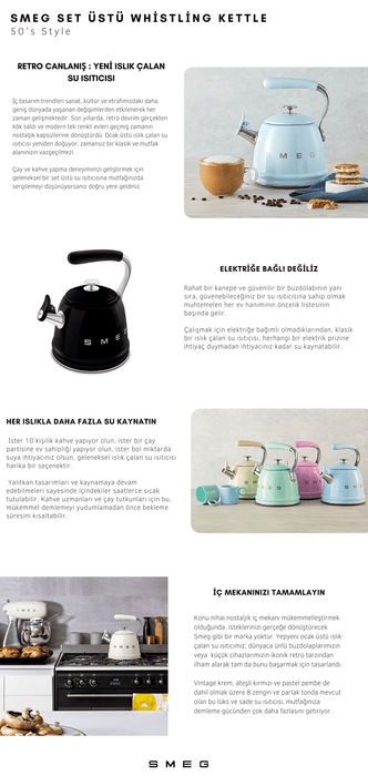 Smeg Ocak Üstü Islıklı Whistling Kettle Su Isıtıcısı, Raffaella Mangiarotti ve Matteo Bazzicalupo (Deepdesign) tarafından tasarlanmış ikonik bir nesnedir. Kompakt boyutu sayesinde, sınırlı alanlara sahip olanlar da dahil olmak üzere her ortamı dekore etmek için mükemmeldir.