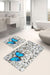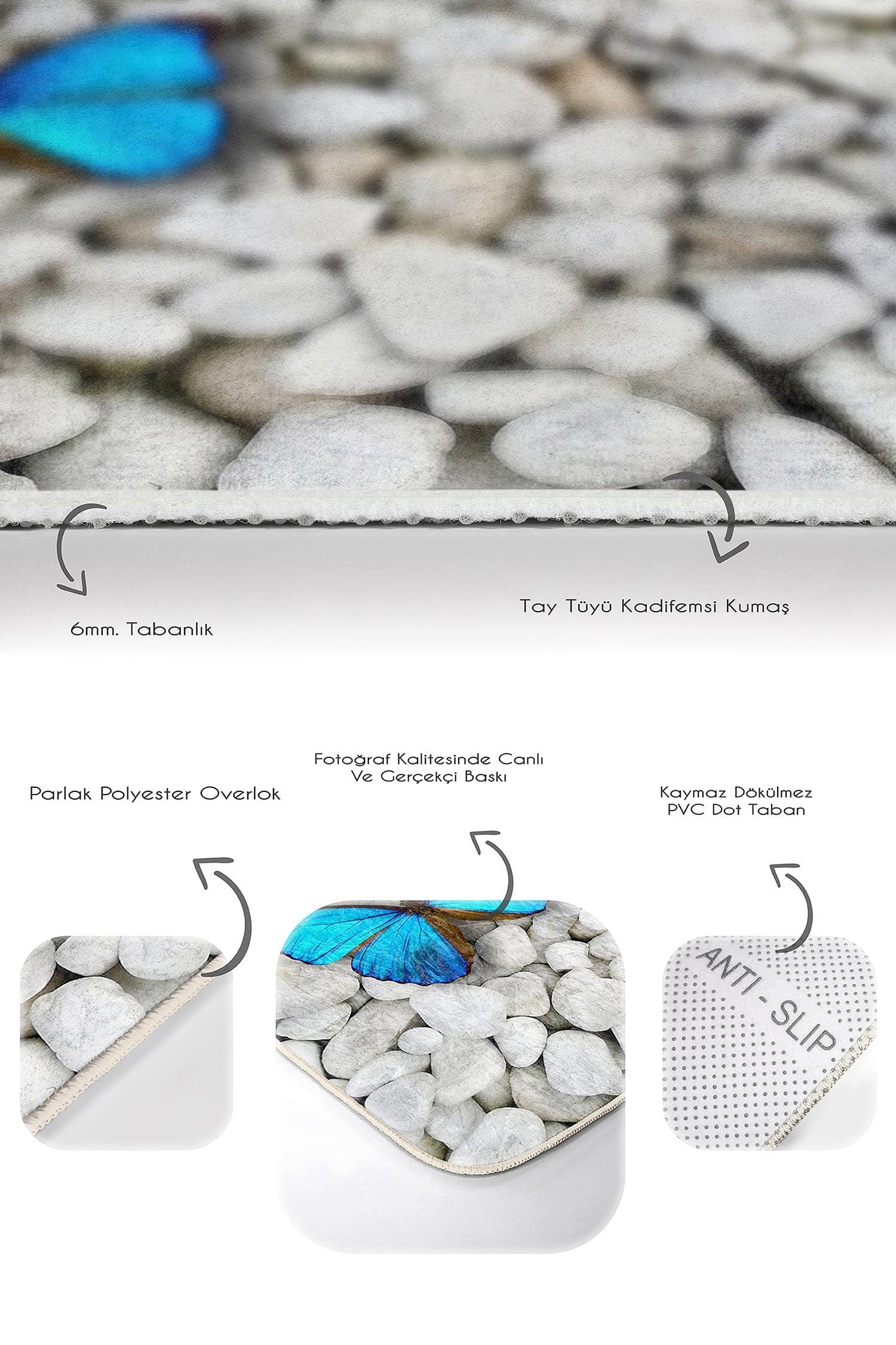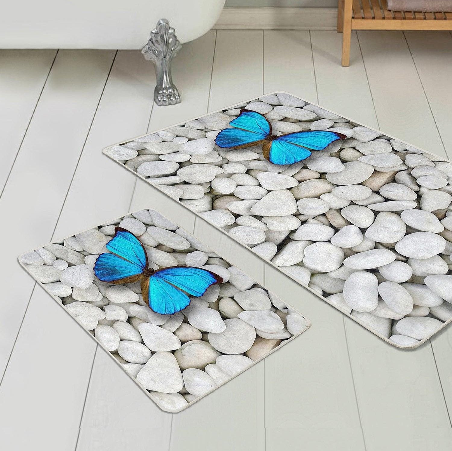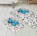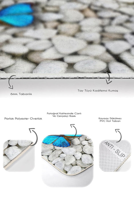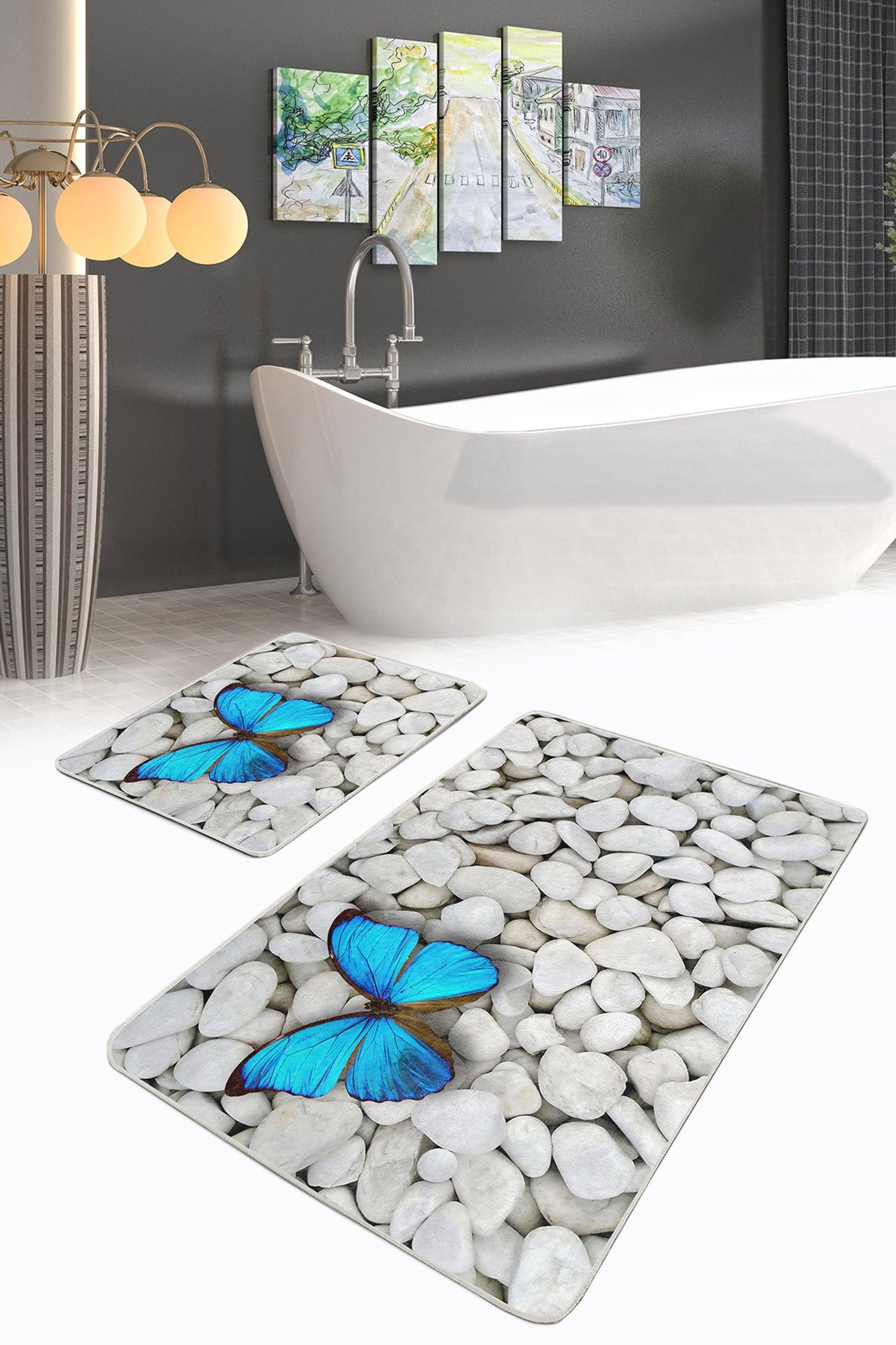 Taş Zemin Mavi Kelebek Dijital Baskılı 2li Banyo Paspas ve Halısı Takımı Kaymaz Taban Yıkanabilir